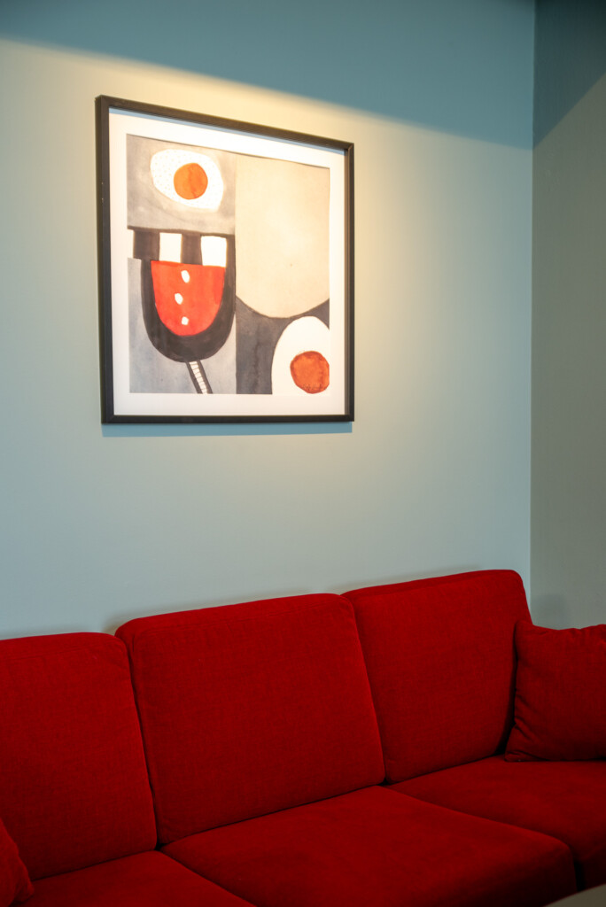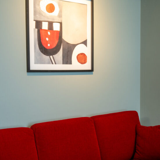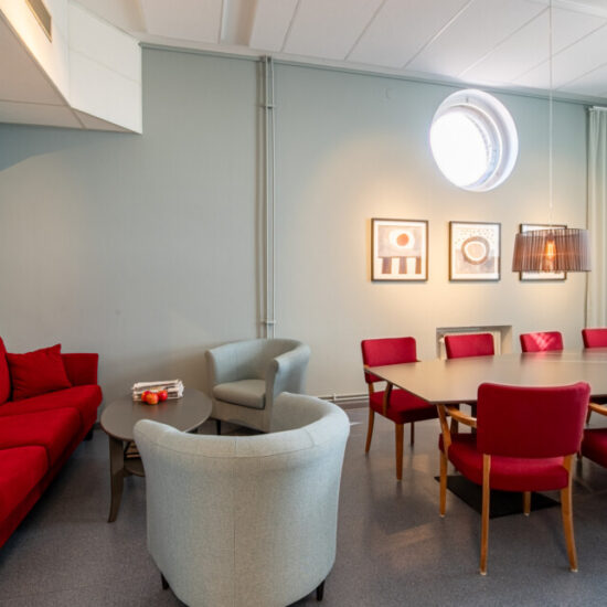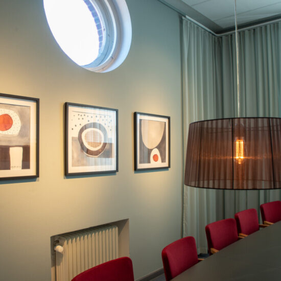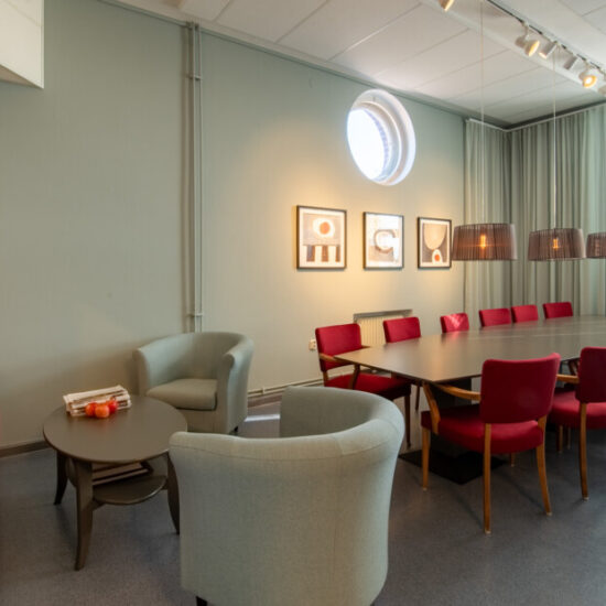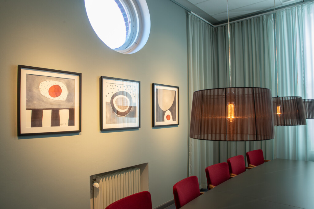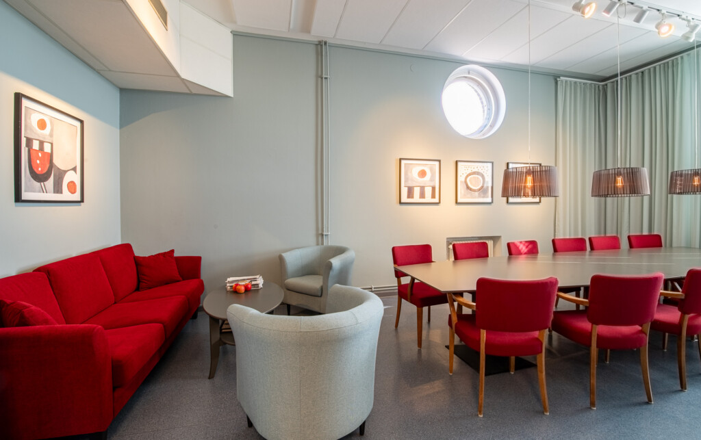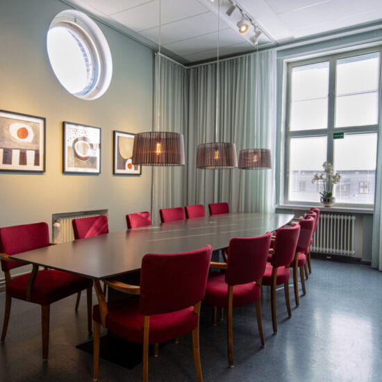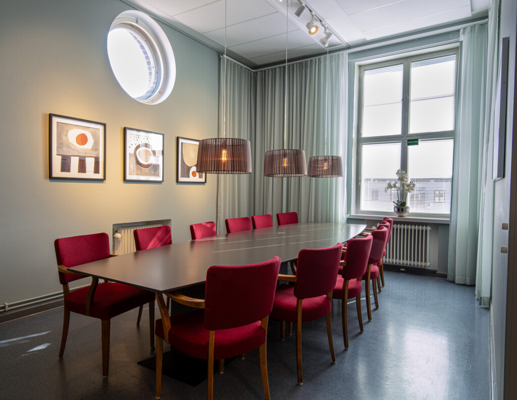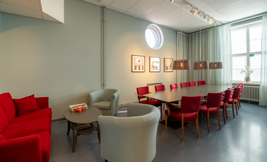 Fräscht, funktionellt, neutralt med respekt för husets historia och inom liten budget. Det var beställningen när vi fick möjligheten att göra om lärarrummet i den södra filialen av Högskolan på Åland. Här fanns takhöjd, vackra fönster med generöst ljusinsläpp, bekväma och vackra vintagestolar och ett användbart stort konferensbord. Genom att måla om väggarna och borden, köpa en ny soffa och fåtöljer, klä om de gamla stolarna, sätta upp nya gardiner och förstärka belysningen med några fler spotlights i befintliga skenor gav vi rummet ett lyft. Pricken över i:et är tavlorna, målade av Eva-Jo speciellt för det här rummet. Helheten är en harmonisk men oväntad kombination av färg och form.
